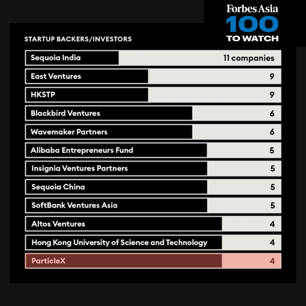 We are thrilled and honored to be recognized on the Forbes Asia 100 to Watch list of leading startup backers/ investors. We appreciate not just the acknowledgment, but also the opportunity to collaborate with so many venture partners, including Hong Kong Science and Technology Park, Alibaba Entrepreneurs Fund, Hong Kong University of Science and Technology, and many more.