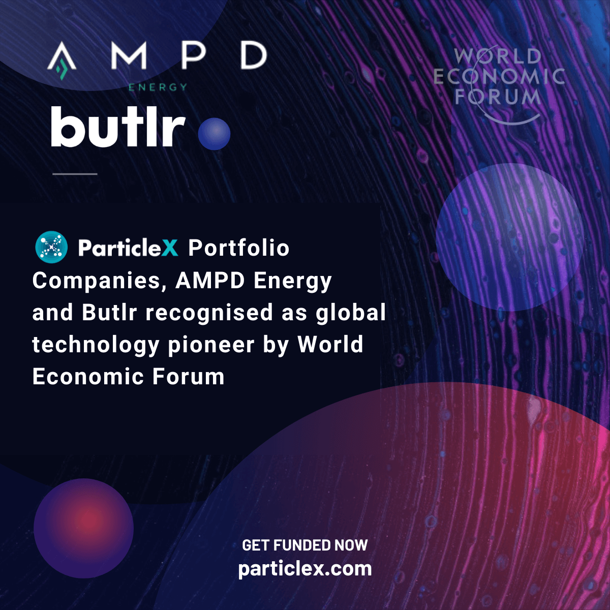 ParticleX’s portfolio companies, AMPD Energy and Butlr which were chosen from hundreds of candidates to be named as the World Economic Forum’s “Technology Pioneers”.