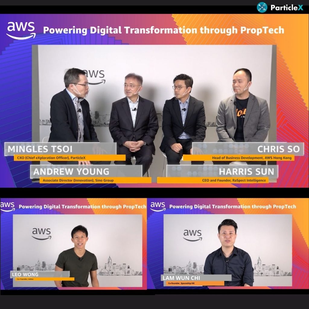 14 May 2021, First co-hosted event by ParticleX and Amazon Web Services (AWS) was launched successfully today. Huge thanks to Ir. Andrew Young – Sino Group, Chris So Amazon Web Services (AWS), Harris SUN – RaSpect Intelligence Inspection Limited, Lam Wun Chi – SpaceshipHK and Leo Wong – imBee Limited and our CXO, Mingles Tsoi who spoke at the “Powering Digital Transformation through PropTech“. They shared with us their invaluable insights, latest market trend, in-depth analysis on the property life cycle and thoughts on the possibilities of future PropTech.