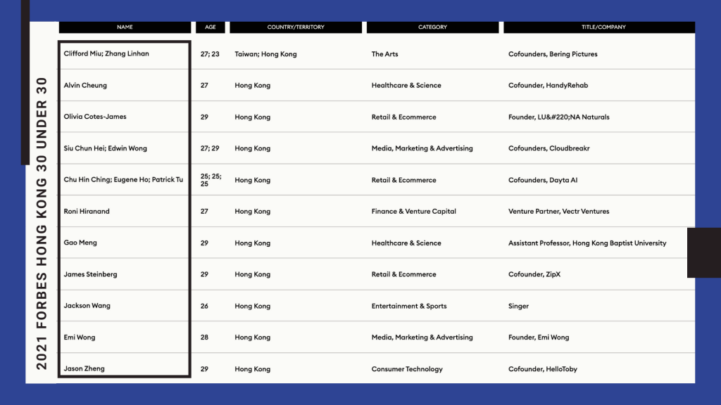 List of 30 under 30 in Asia, Hong Kong